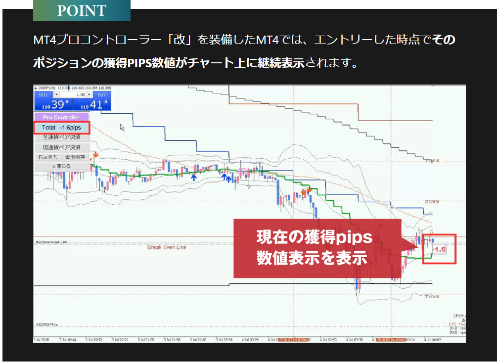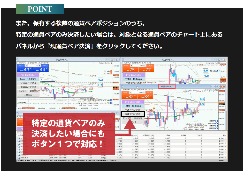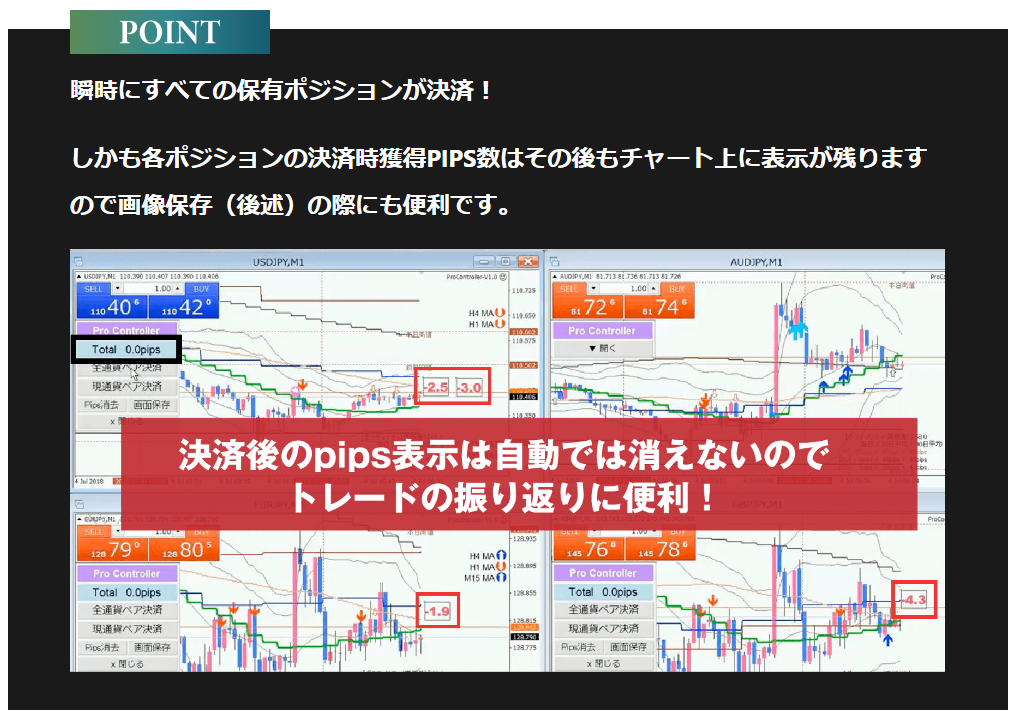 【現在の獲得pipsが表示】【複数ポジション保有時|合計pips表示】【複数ポジション|各ポジションのpips表示】【特定の通貨ペアの決済もボタン一つ】【決済後|トレードの振り返りに利用可】